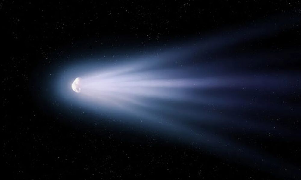 Cuando un cometa se acerca al Sol, el hielo que contiene su núcleo pasa al estado gaseoso y suelta una larga cola que refleja la luz del astro rey.