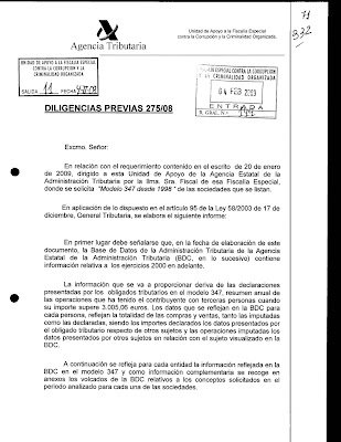 De la parte sumarial que ha sido levantado el secreto, es posible por el momento disponer de una docena de informes de la UDEF. El primero tiene fecha de 04.12.07 y de manera clara explica el modus operandi de la trama y propone a la Fiscalía que se soliciten informes a la AET , se intervengan judicialmente varios teléfonos moviles, sms enviados y recibidos de esos mismos telefonos asi como otras pruebas variopintas .
