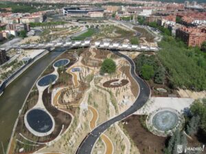 Madrid Río completa la escena: donde antes rugían autos hoy se despliega un parque que abraza al Manzanares. Familias, corredores, ciclistas, curiosos. Todos encuentran su momento, y el rumor del agua —en forma de ría o de fuentes urbanas— funciona como una banda sonora improvisada. Desde aquí, el skyline del Palacio Real y La Almudena se transforma en un cuadro que uno quisiera llevarse a casa.