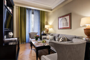 La historia del palacio se hace presente con discreción en cada superficie. Este edificio romano, situado en una de las zonas más distinguidas de la ciudad, conserva la memoria de un pasado aristocrático que convive con naturalidad con la visión contemporánea de Rocco Forte. La restauración supo respetar la identidad original del inmueble, integrando materiales nobles y líneas modernas sin alterar el espíritu que lo define. Mármol, estuco, maderas claras y tejidos suaves conforman un interior donde pasado y presente dialogan en armonía.
