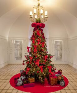Piezas de diseño de Tagliatore que adornan el árbol de Navidad de Villa Igiea en Palermo. Pañuelos de seda, telas finas, textiles refinados y detalles de sastrería se transforman en delicados adornos, dando vida a una decoración inspirada en las paletas de rojo y blanco características de la marca hotelera.