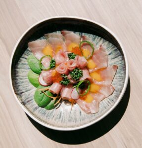 La propuesta culinaria refleja esa misma amplitud. En la cafetería destacan cornetti, pasticciotti, brioche, muffins, tortas y bombones. El sushi forma parte del ADN del proyecto desde 2006 y se elabora con ingredientes locales de excelencia, como el gambero viola de Gallipoli y el tomate semiseco de Torre Guaceto. En la cocina se encuentran platos como el spaghettone a la chitarra con atún fresco y limón, el risotto de gambas con extracto de limón y albahaca, el pacchero con ragú de mero, el pulpo cocido en aceite y terminado al romero con giardiniera casera y el huevo a baja temperatura que cambia según la temporada.