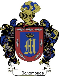 En campo de azur, una letra M de oro, coronada del mismo metal. bordura de gules, con siete peces de plata.